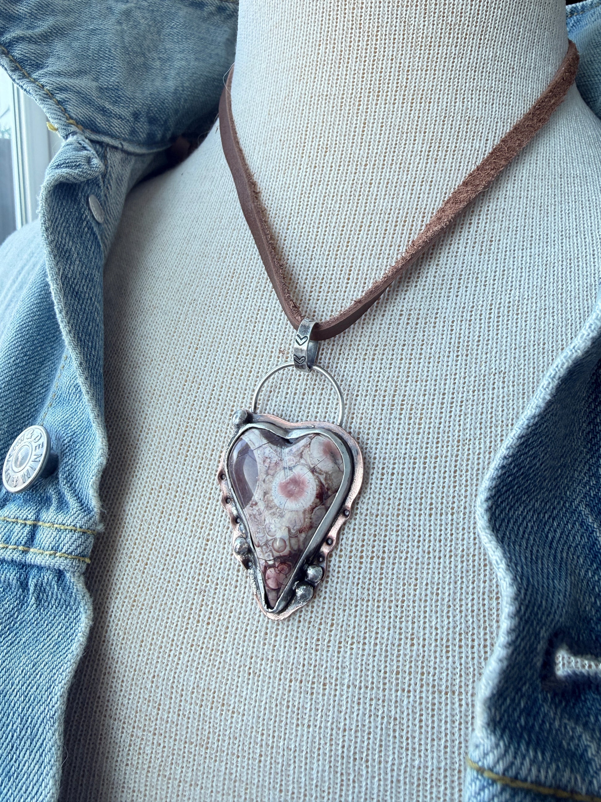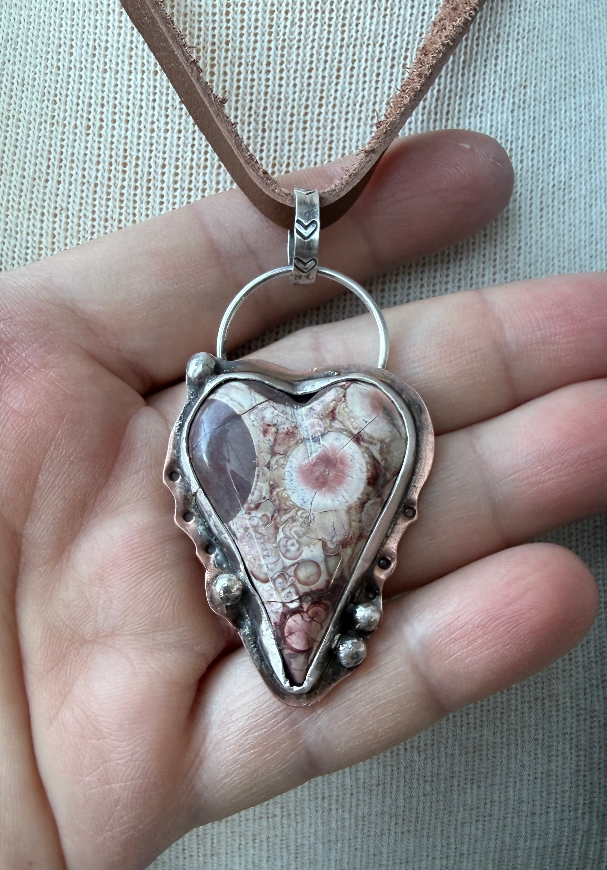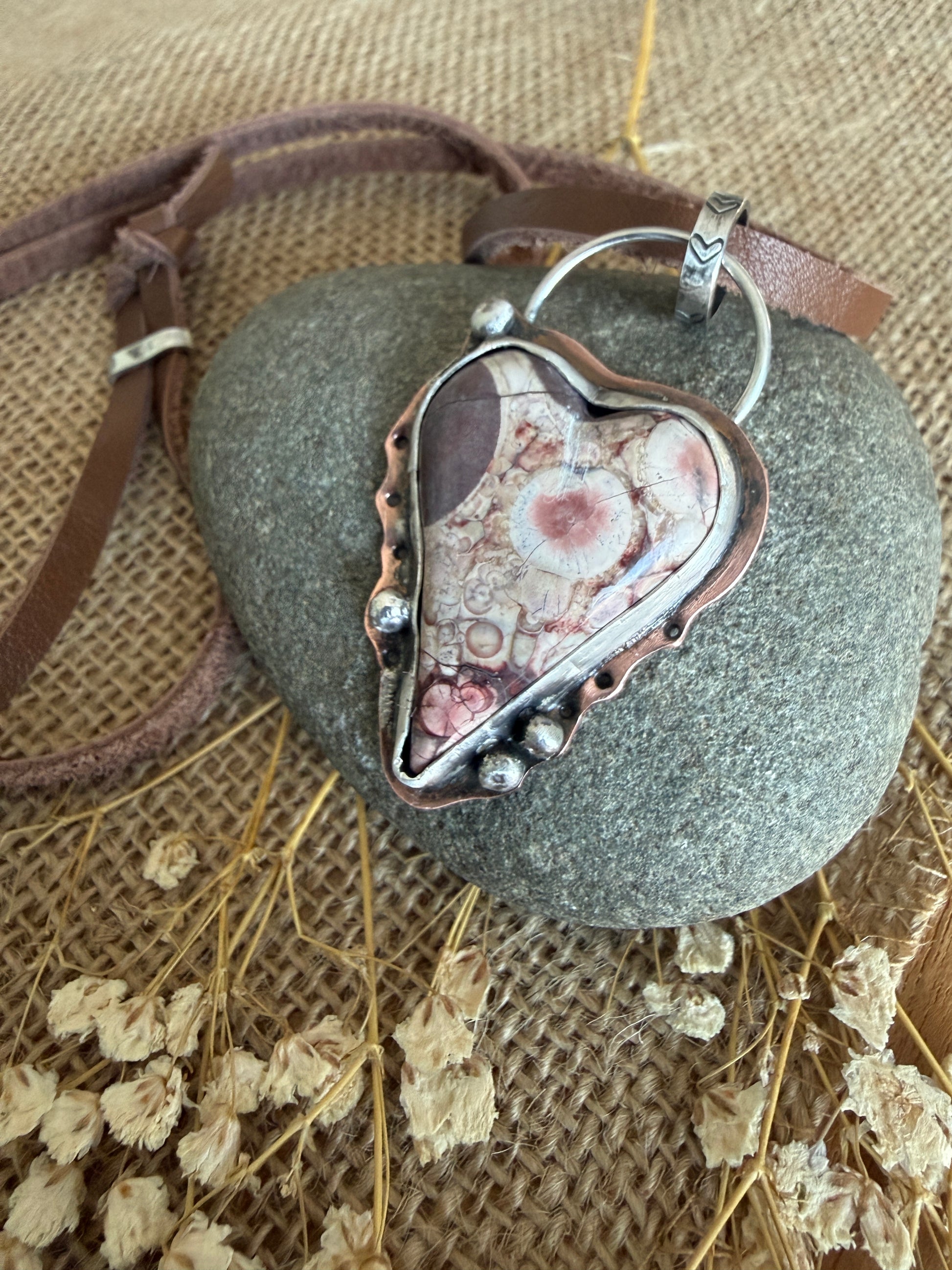 Beautiful Birds Eye Rhyolite stone heart is bezel set in fine silver on a copper backplate with sterling silver ball accents. I sealed the copper to resist tarnish. The pendant measures 2.25”h x 1.75”w. The pendant hangs on soft brown leather that measures 28” in length and can be adjusted by sliding the hand made sterling silver bead to shorten the length.