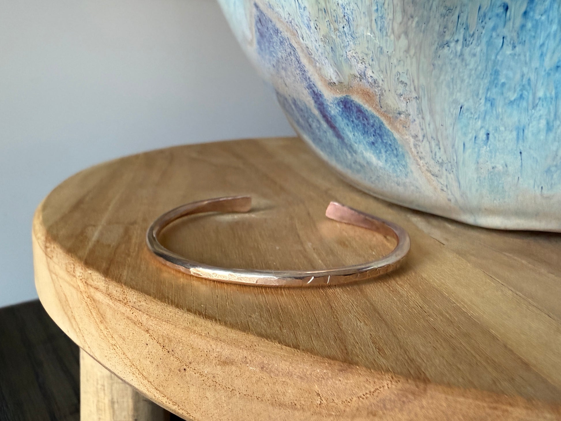 Simple heavy gauge brass cuff with a light hammered texture. I gave it a high shine. This one fits a small wrist. I can make them in different sizes. Contact me if you would like a custom size.