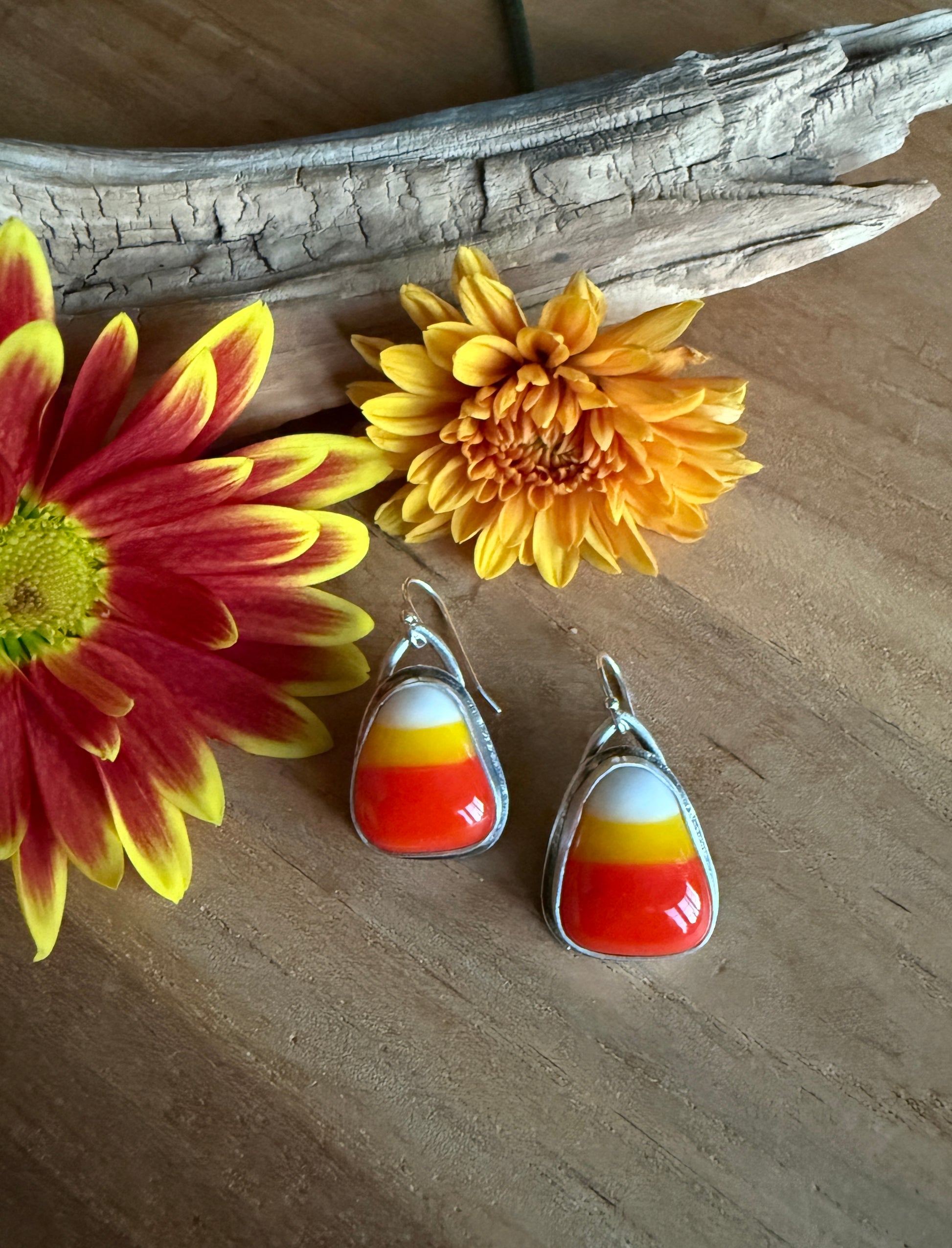 Sweet candy corn earrings, made of boro glass and bezel set in sterling silver. They dangle from sterling silver ear wires. They are lightweight. They measure 1.25" in total length. So cute for the Halloween season.