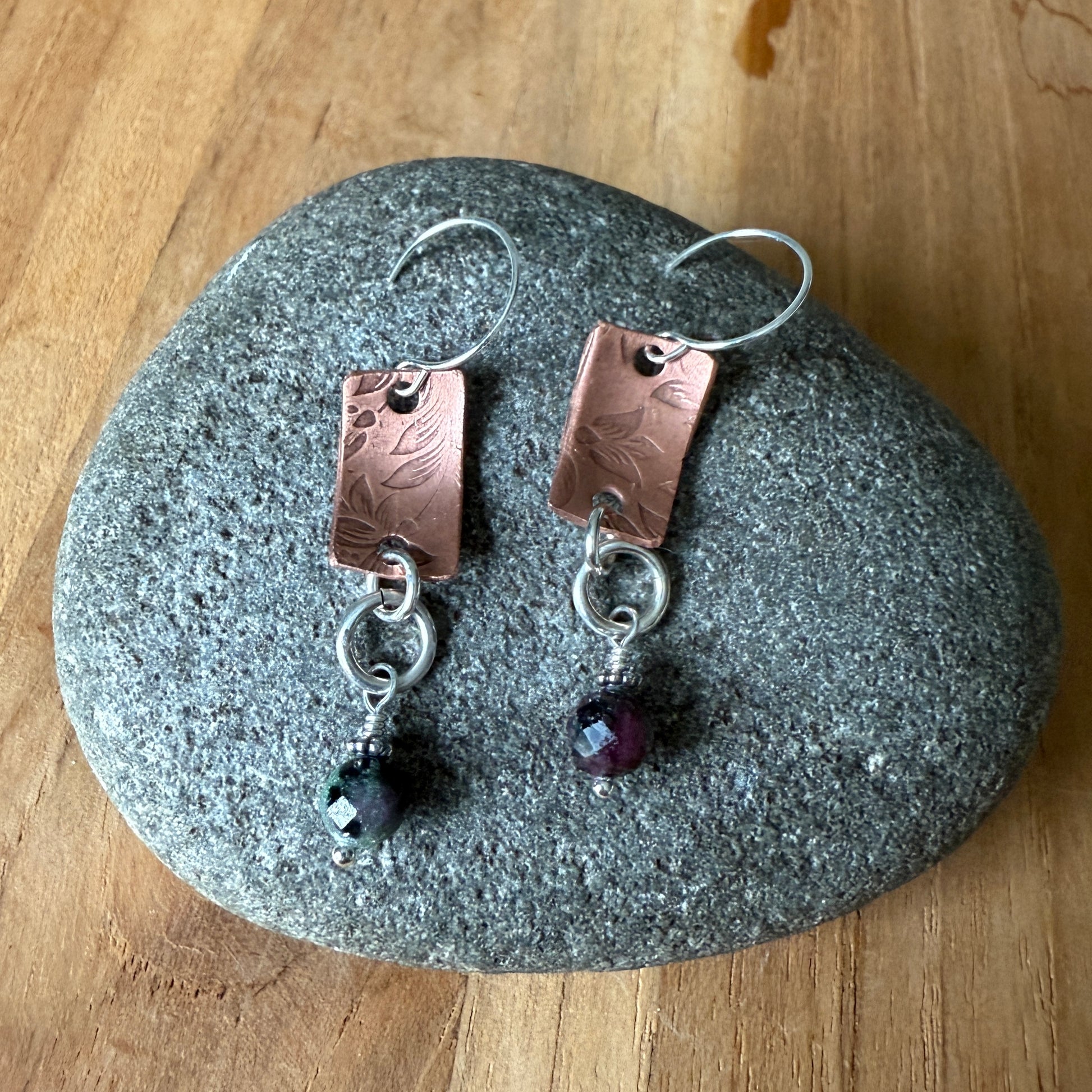 Petite dangle earrings made of sterling silver, copper and ruby zoisite. The copper is embossed with a floral pattern. Ruby zoisite stones dangle from them. Sterling silver ear wires and components were used. Ruby zoisite stone is a fusion of red ruby with vivid green zoisite. Very lightweight. They measures 1.75" in total length.