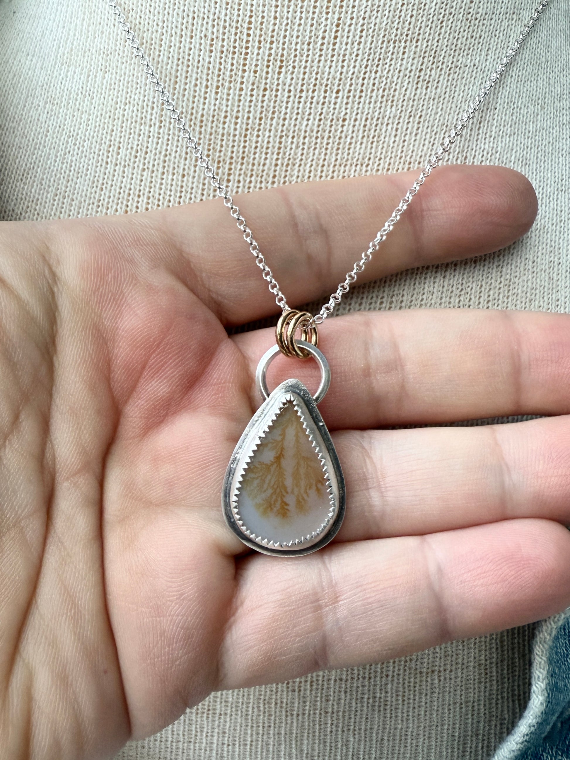 This necklace is made of a dendritic agate stone set in sterling silver. It hangs on a sterling silver adjustable chain. The chain can be worn at 16", 18" or 20" lengths. The pendant hangs on gold filled jump rings. It measures 1.25"L x 3/4W. I oxidized it and gave it a matte polish.