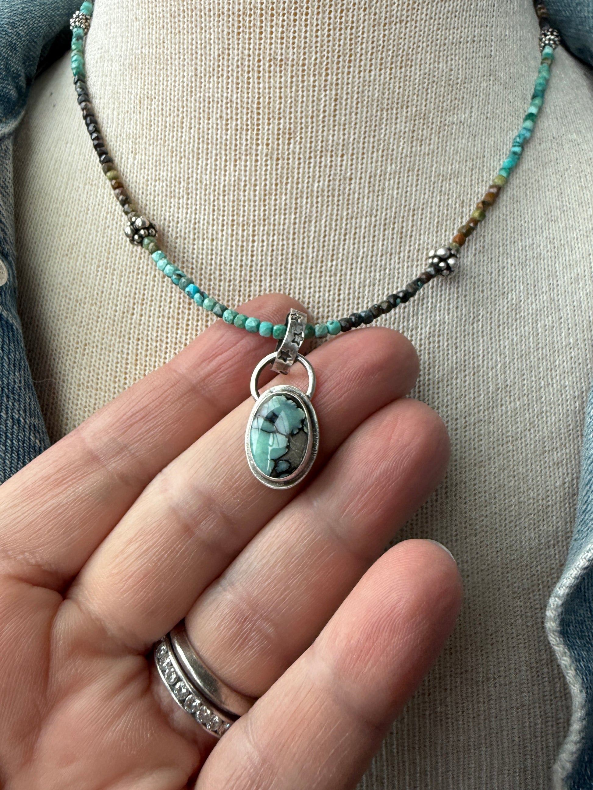 This beauty is all turquoise! The necklace itself is made up of tiny 3mm turquoise stones with sterling silver beads scattered throughout. The pendant is made of desert bloom variscite, which I bezel set in sterling silver. The pendant measures 1.25" in length. The necklace measures 16" with a 2" extender, making it so you can wear it at 18" too. I used a lobster claw clasp.