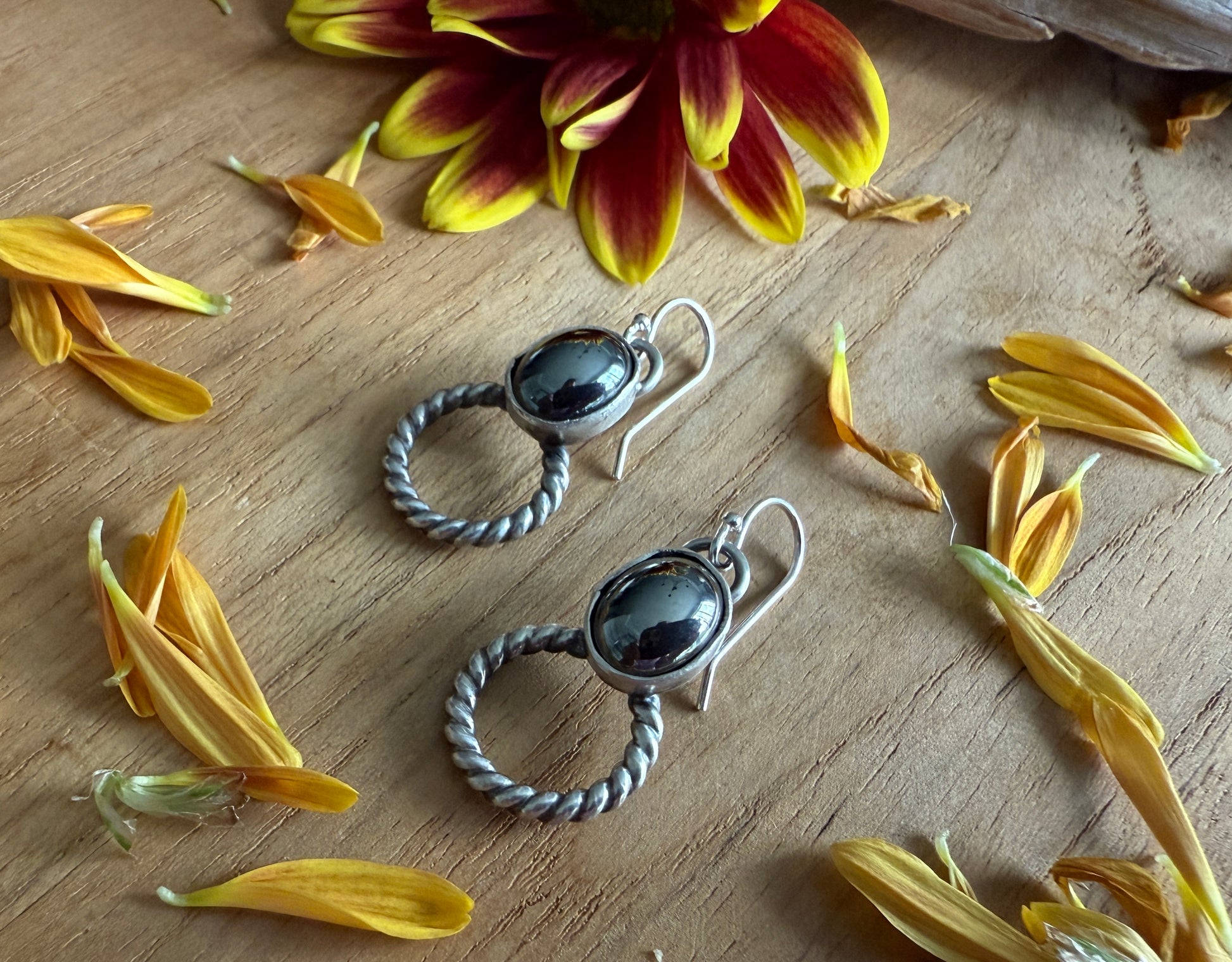 Sterling silver rope circle earrings bezel set with hematite stones. The earrings dangle on sterling silver ear wires. They are oxidized with a matte polish. The measure 1.25"L x 1/2"W.