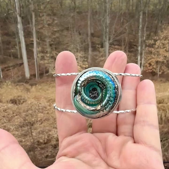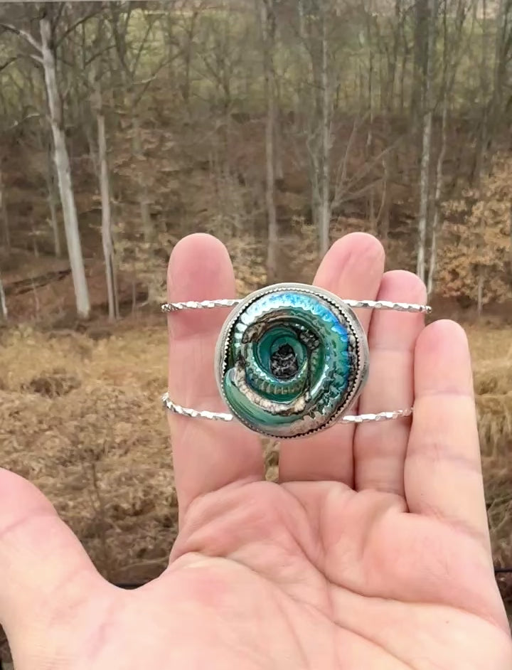 Beautiful lamp work glass ammonite that’s bezel set in fine silver and made into a cuff bracelet. The cuff is made of diamond cut sterling silver wire. I added a small wave pattern detail to the ends of the cuff. This cuff will fit a larger wrist. It fits my wrist and I’m a size 7. It can fit larger. It can squeezed carefully to be tightened on your wrist. It’s a statement piece. The ammonite setting is 1.75” in diameter.