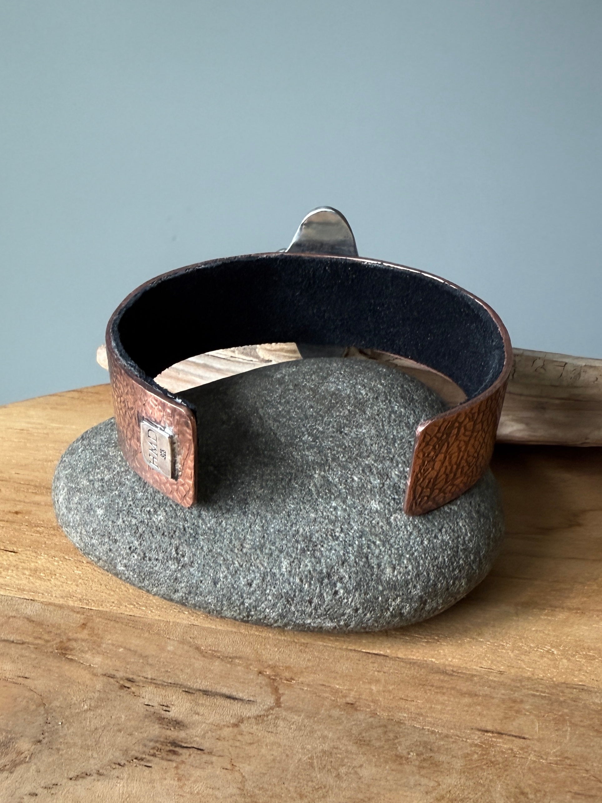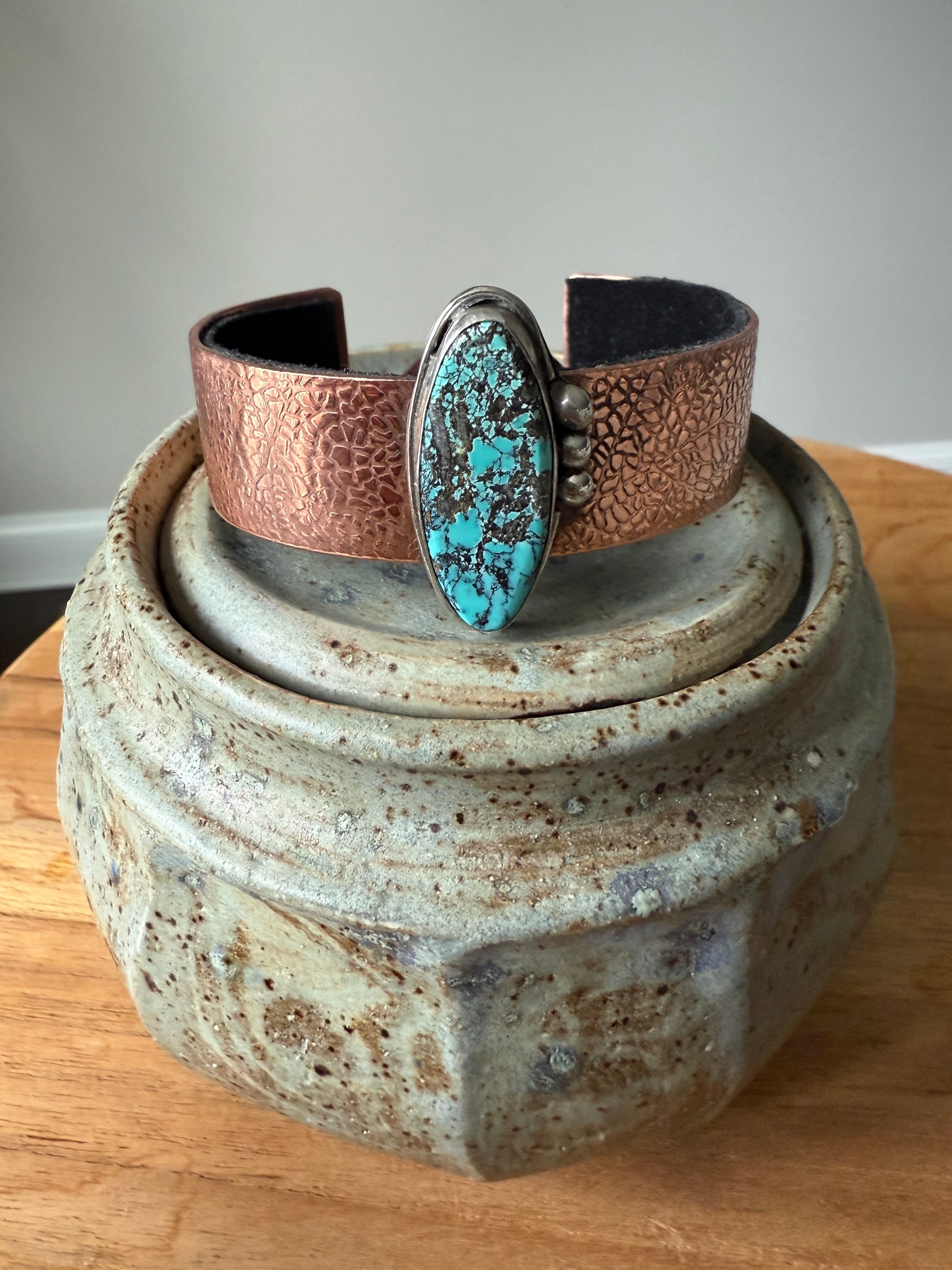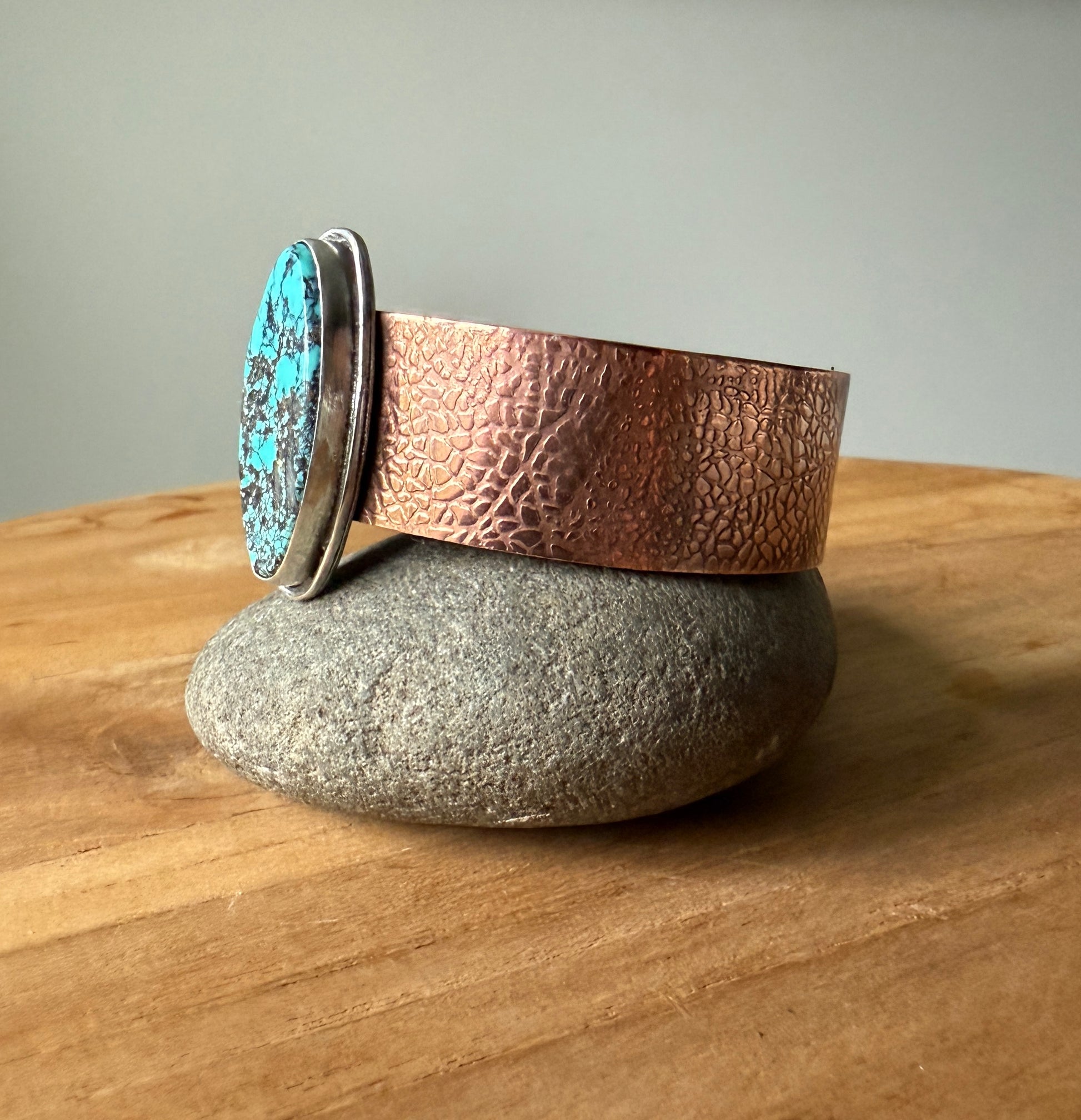 Copper cuff set with moon river turquoise. The cuff is embossed with a beautiful crackle leaf imprint and is made of 16 gauge copper. I set a beautiful moon river turquoise stone as the focal. The stone is set in sterling silver. The copper cuff is lined with soft black suede. The cuff is 3/4" x6". The stone setting measures 1.5"L.