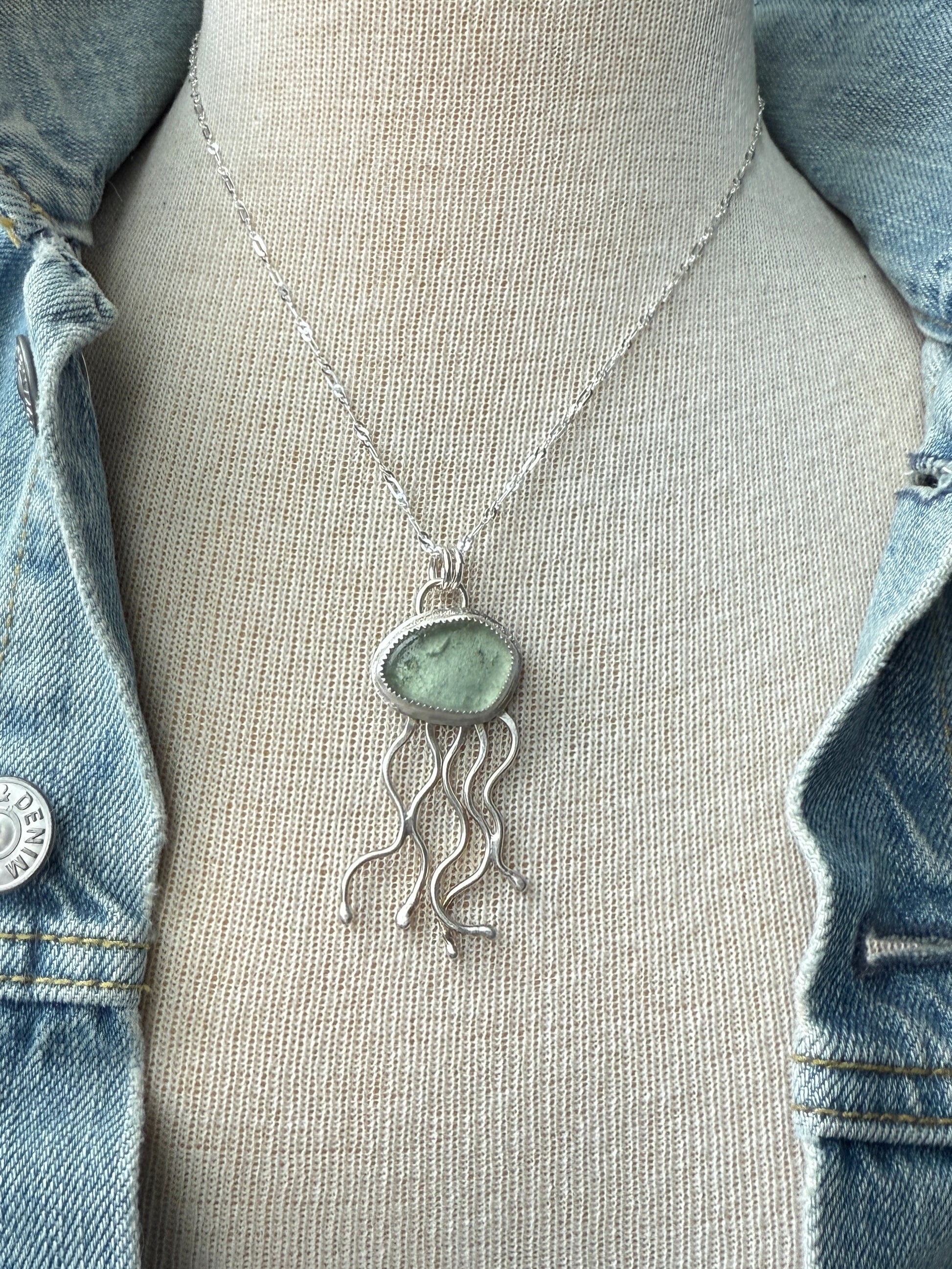 I created this jelly fish necklace using sterling silver wire, sterling silver sheet and a piece of beautiful sea foam green sea glass. The sea glass is bezel set in sterling silver. The jelly fish pendant measures 1.75" in length and 3/4" in width. It hangs on an 18" sterling silver chain. Lightly oxidized and it has a shiny polish.