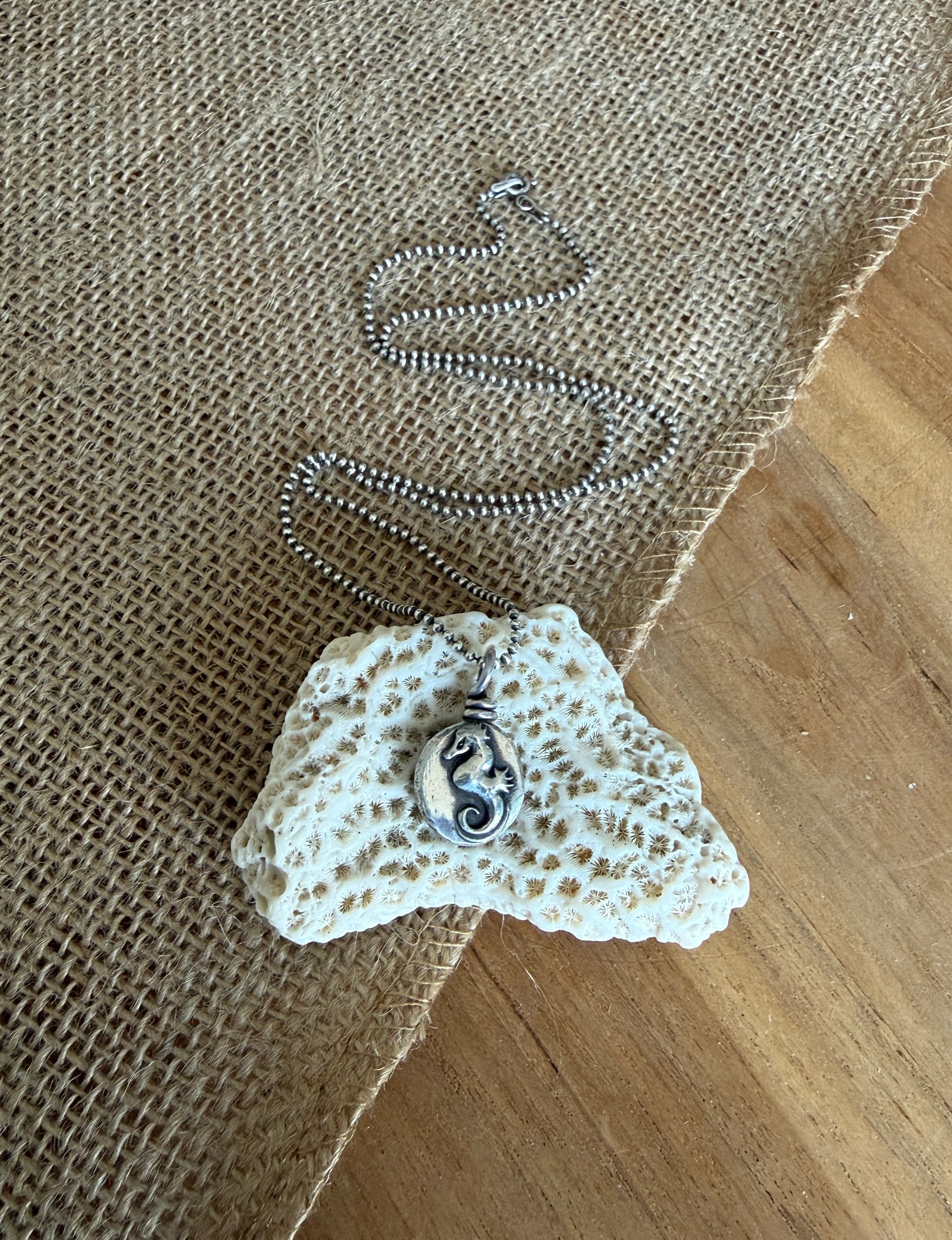 Beautiful necklace made of 100% recycled sterling silver. I melted down leftover sterling silver and hammered this cute sea horse into it using vintage impression dies. The pendant measures approx. 3/4"H. It hangs on an 18" sterling silver ball chain. I oxidized it and gave it a shiny polish.