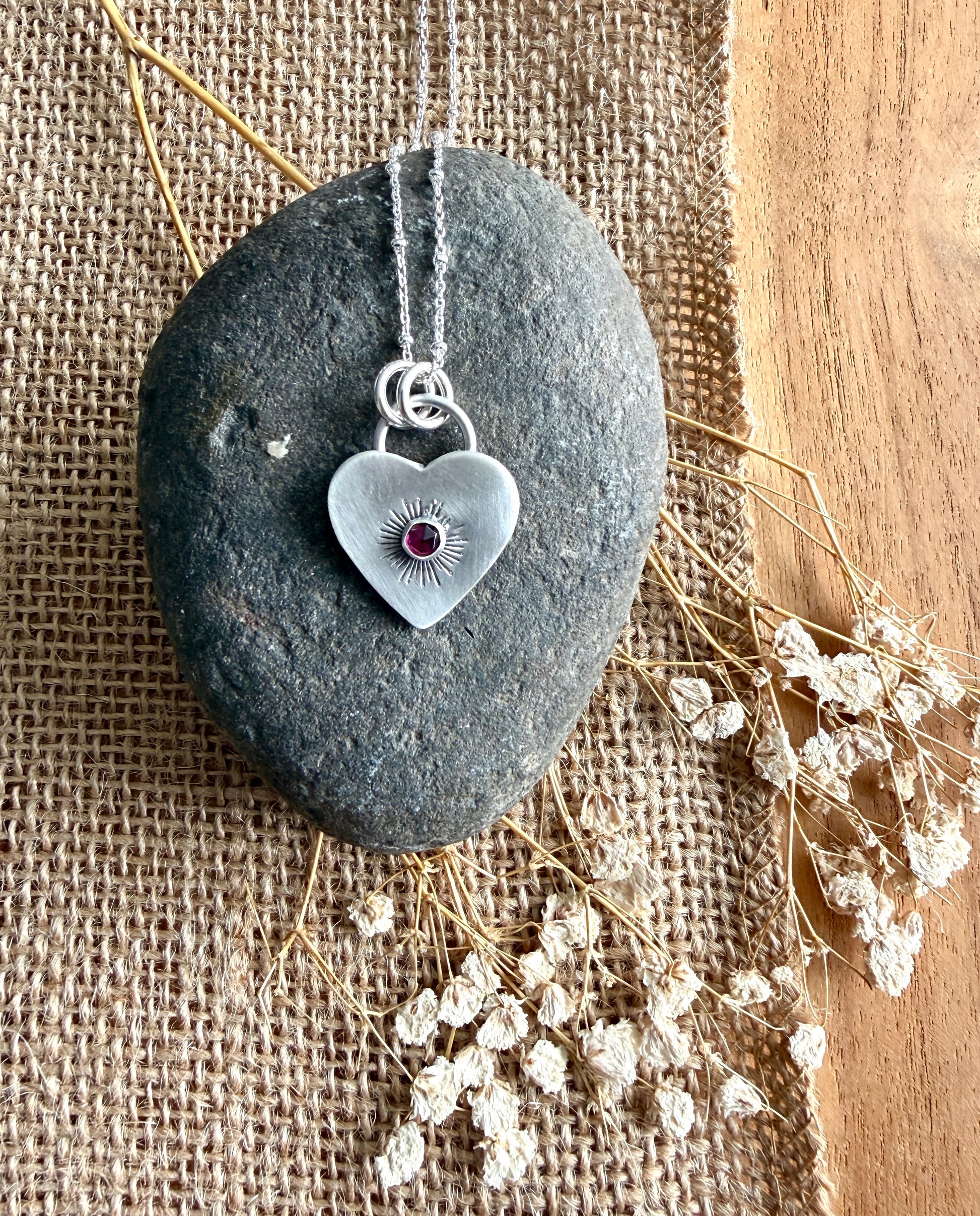 Sterling silver heart pendant, bezel set with a pretty 4mm garnet stone. The heart measures 1” x 1”. I oxidized it and gave it a matte polish. It hangs on a sterling silver 18” chain.