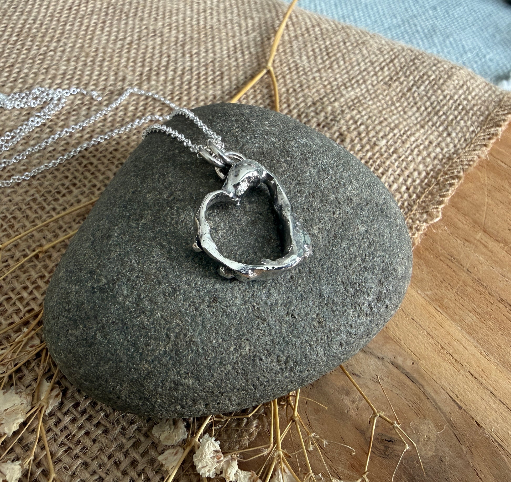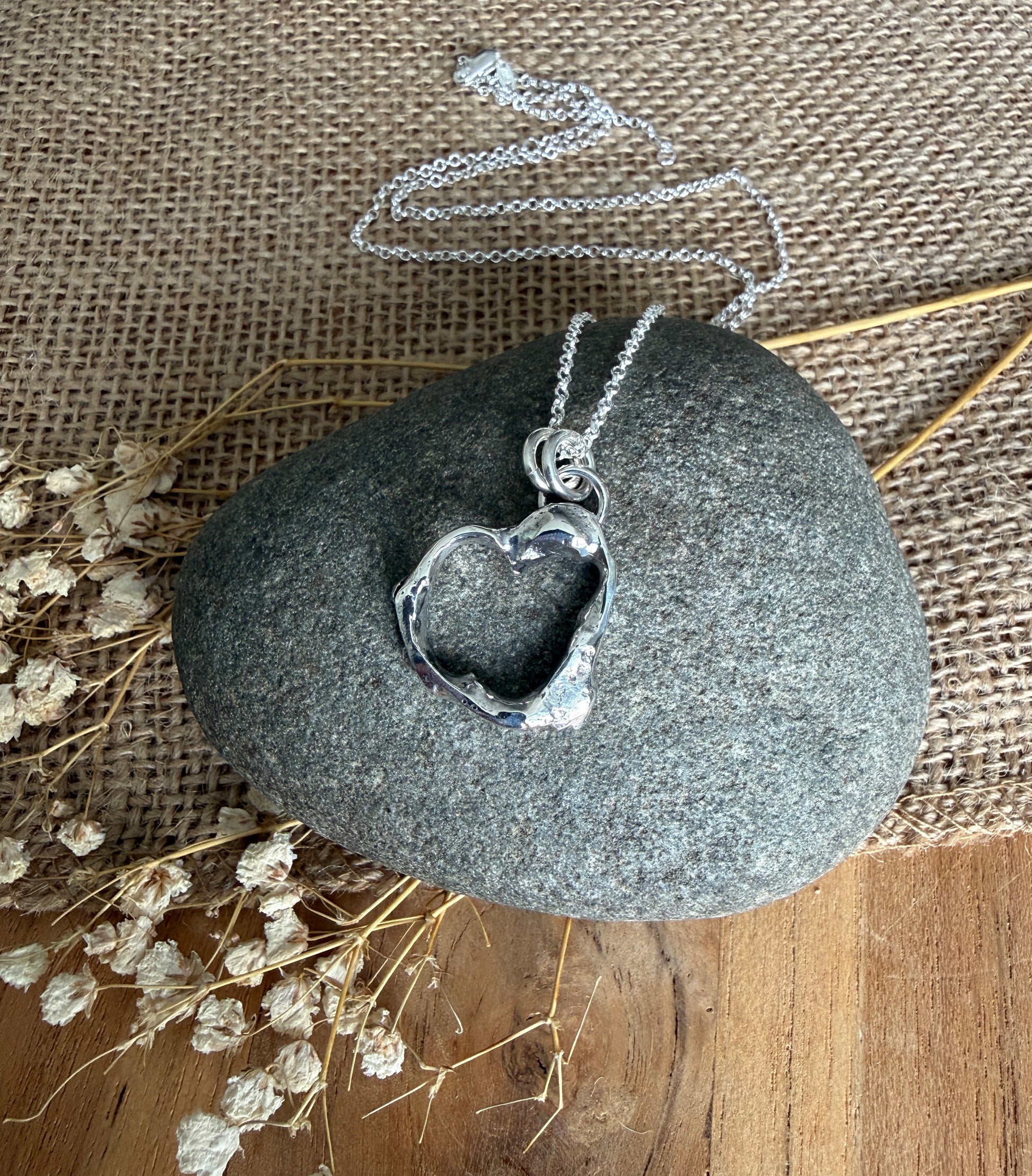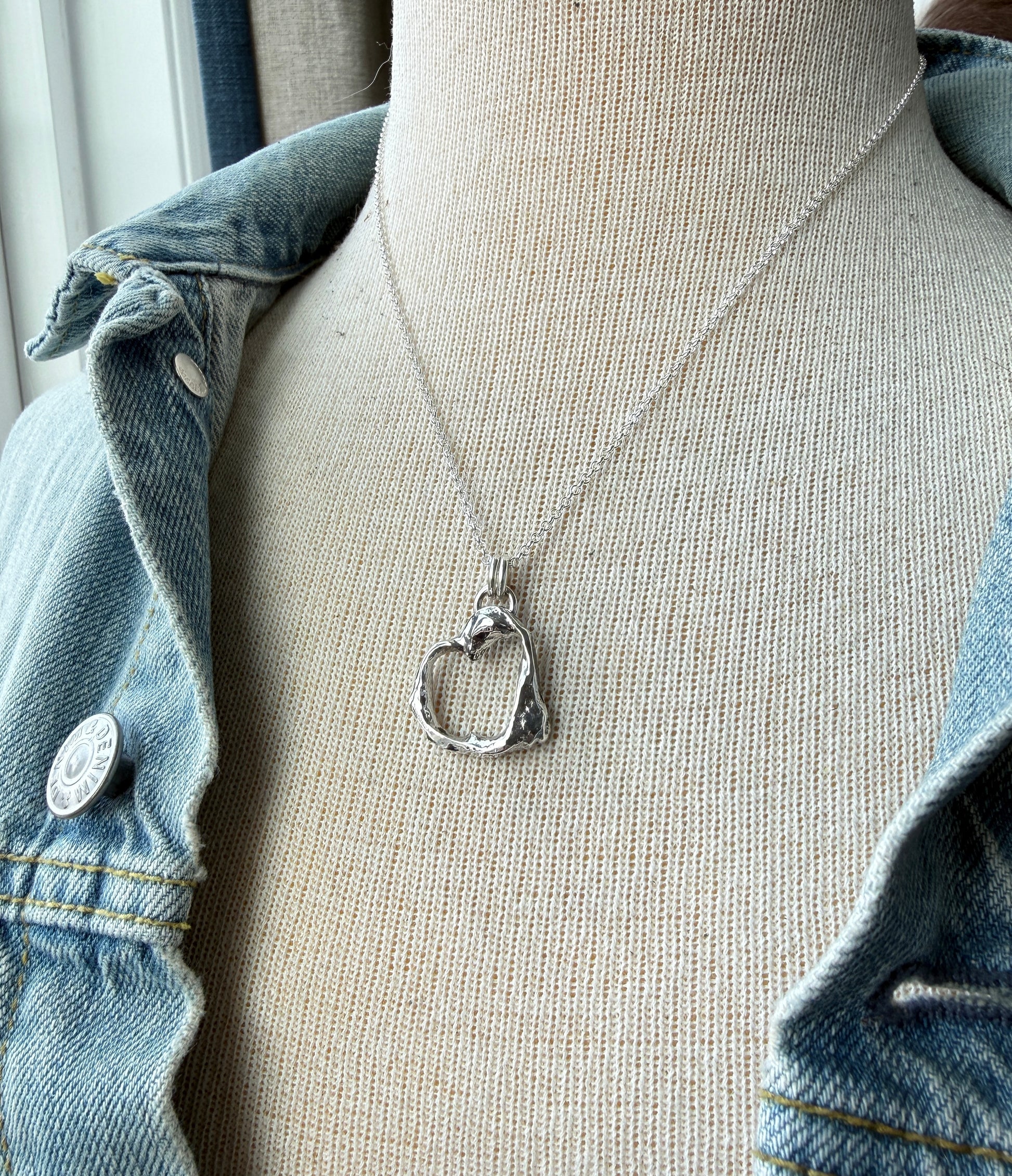 Made of 100% recycled sterling silver, I layered pieces of sterling on top of each other and slowly melted the metal until I had the desired heart shape. I’m calling this the resilient heart. I oxidized and polished the heart and hung it on an adjustable sterling silver chain that you can wear at 16”, 18” or 20” lengths. The pendant measures 1” x 1”.