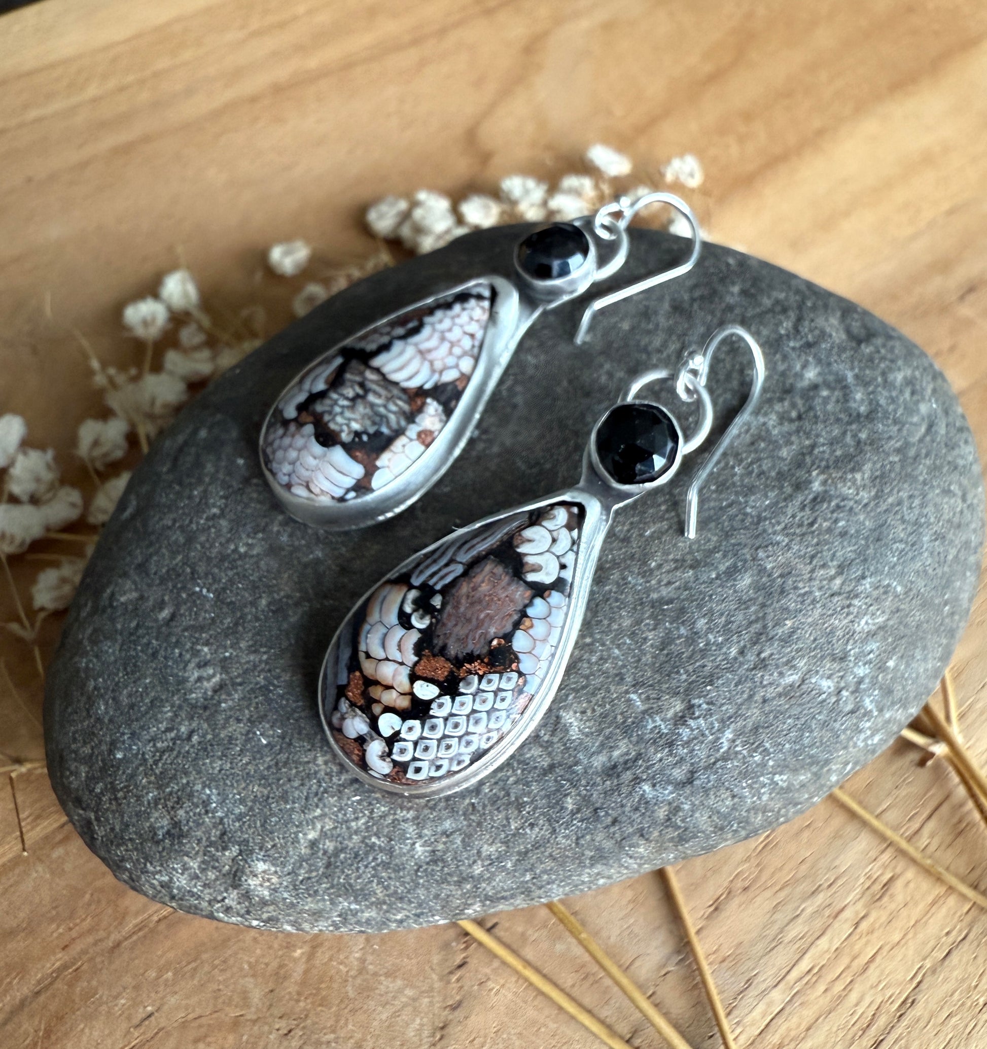 Earrings made of snake skin stone and black spinel stones. Bezel set in sterling silver, oxidized and given a matte polish. They are 2.25" in total length. They are 5/8" in width. Lightweight too.