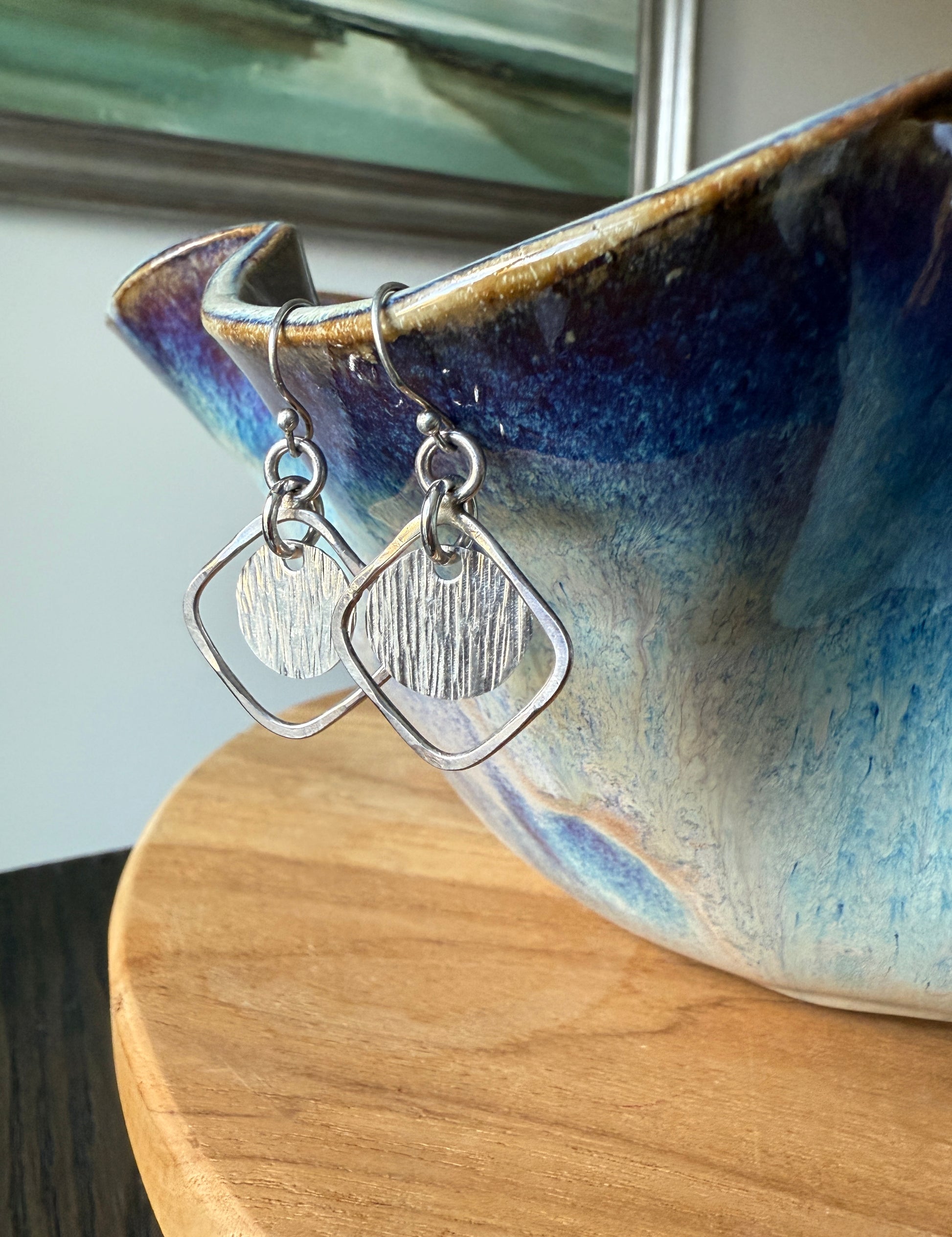 Handmade earrings that are geometric in style. Made of sterling silver, the dangles consist of a diamond shape with a hammered textured disc in the center. Very cool and fun earrings. They are lightweight and measure 1.75" in total length. The diamonds measure 7/8" and the discs are 1/2". They have a shiny polish.