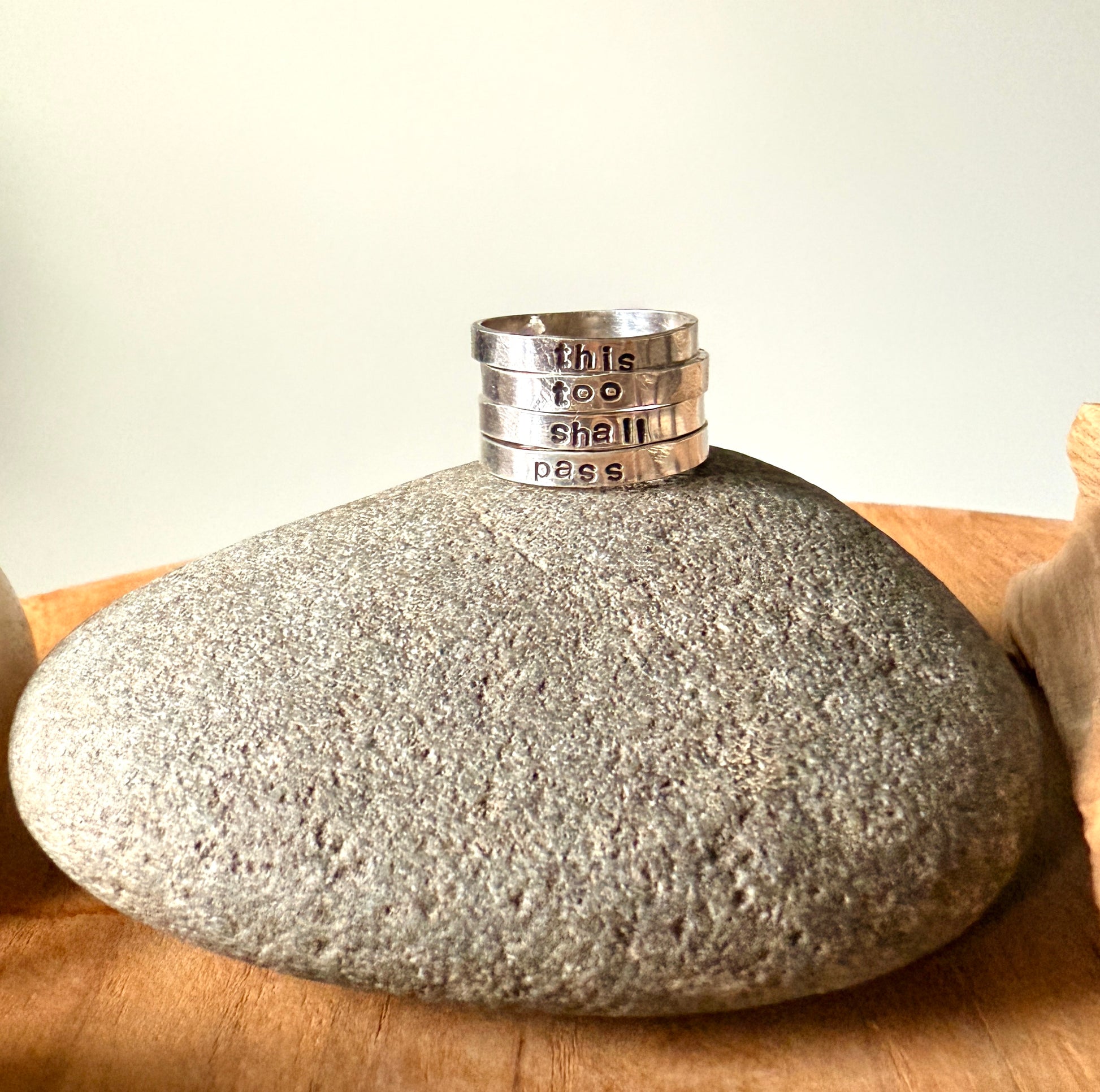 Hand stamped sterling silver rings that are stamped to read "this too shall pass". Each rings has a word on it, so 4 rings in total. I hand make the rings using 3mm sterling silver heavy gauge wire. Each is hand stamped. This ring set is a size 8. This ring set is already made and ready to ship. If you would like one like this made in a different size, please go to the hand stamped ring item to order it in a different size.